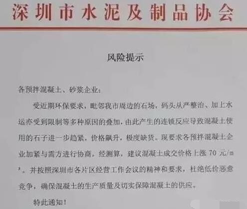 受近期商品混凝土原材料(碎石、砂)持續(xù)漲價的影響,深圳市水泥及制品協(xié)會終于發(fā)布商品混凝土、預(yù)拌砂漿企業(yè)風險提示函,表示,因原材料價格持續(xù)上漲,商品混凝土價格建議,上調(diào)70元/立方米。目前,深圳市及周邊地區(qū)大多數(shù)混凝土企業(yè)混凝土價格已經(jīng)上調(diào),瘋狂的石頭再次上演【漲、漲、漲】何時能夠穩(wěn)定一來,還有待觀望。