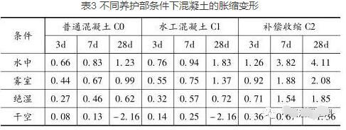 脹縮變形是混凝土的一項(xiàng)重要性質(zhì),不同的濕度條件和水分會(huì)對(duì)混凝土的脹縮變形造成不同的影響。我們通過(guò)不同的養(yǎng)護(hù)條件所造成的結(jié)果不同的現(xiàn)象,來(lái)探究濕度和水分對(duì)混凝土脹縮變形的影響(見表3)。
