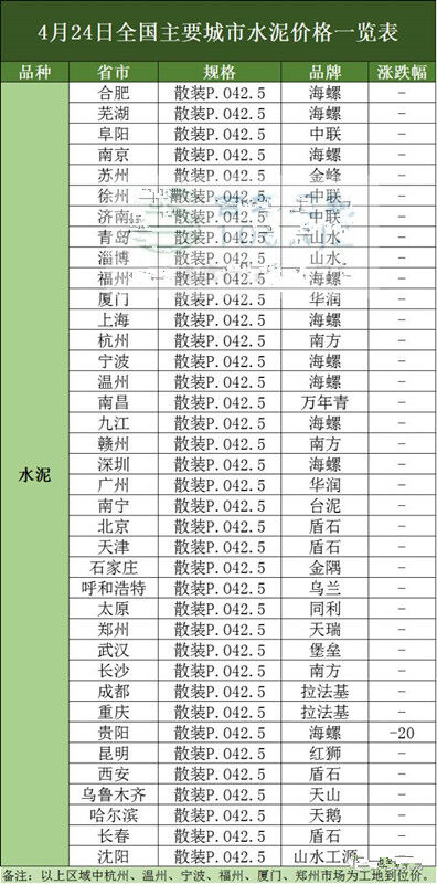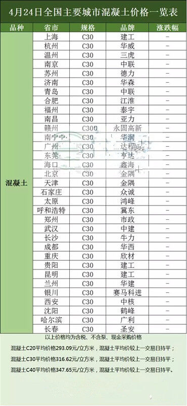 砼商網(wǎng)資源分享,4月24日全國主要城市水泥、混凝土、價(jià)格表。