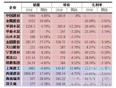 2016年,全國商品混凝土產(chǎn)量17.9億立方米,同比增長7.4%,混凝土與水泥制品行業(yè)實現(xiàn)利潤總額658億元,同比增長4.1%。從上市企業(yè)來看,14家由混凝土業(yè)務經(jīng)營的企業(yè)總銷量同比增長6.25%,但由于大部分企業(yè)混凝土銷售價格出現(xiàn)回落,導致13家企業(yè)(除金隅股份)整體銷售收入同比只有1.25%的提升,而11家企業(yè)(除中國建材、金隅股份、山水水泥)整體毛利潤同比下滑3.3%。