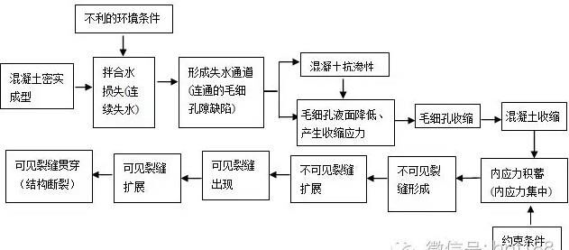 作者在攪拌站成立之初的抗裂實踐中,對這些現(xiàn)象也深感困惑。直到后來明確了早期裂縫是因為混凝土失水過多所致,并對這一機理進行了深入研究,才重新認(rèn)識了混凝土收縮裂縫形成的全過程,如圖1[5]所示。