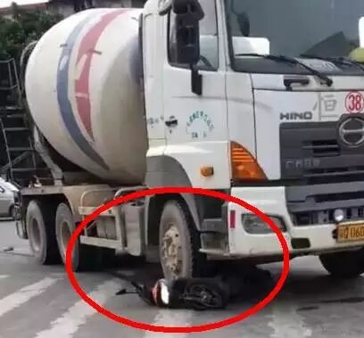 在不遠處,停放著一輛大型攪拌車,右前輪下壓著一輛電動車。附近居民稱,事發(fā)時,女子所騎的電動車與攪拌車發(fā)生碰撞,導致慘劇發(fā)生。