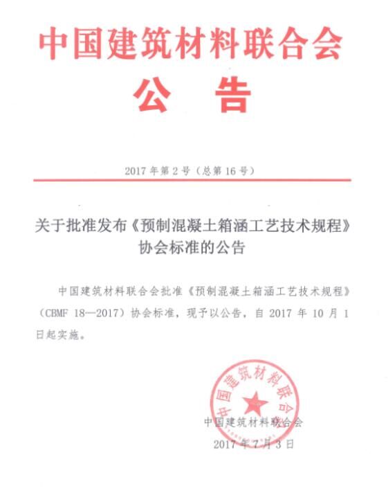 摘要:2017年7月,由中國(guó)混凝土與水泥制品協(xié)會(huì)(以下簡(jiǎn)稱協(xié)會(huì))組織制定的《預(yù)制混凝土箱涵工藝技術(shù)規(guī)程》和《混凝土用氧化鎂膨脹劑》兩項(xiàng)協(xié)會(huì)標(biāo)準(zhǔn),通過審定并發(fā)布批準(zhǔn)公告,標(biāo)準(zhǔn)號(hào)分別為CBMF 18-2017和CBMF 19-2017,將同時(shí)于2017年10月1日起實(shí)施。