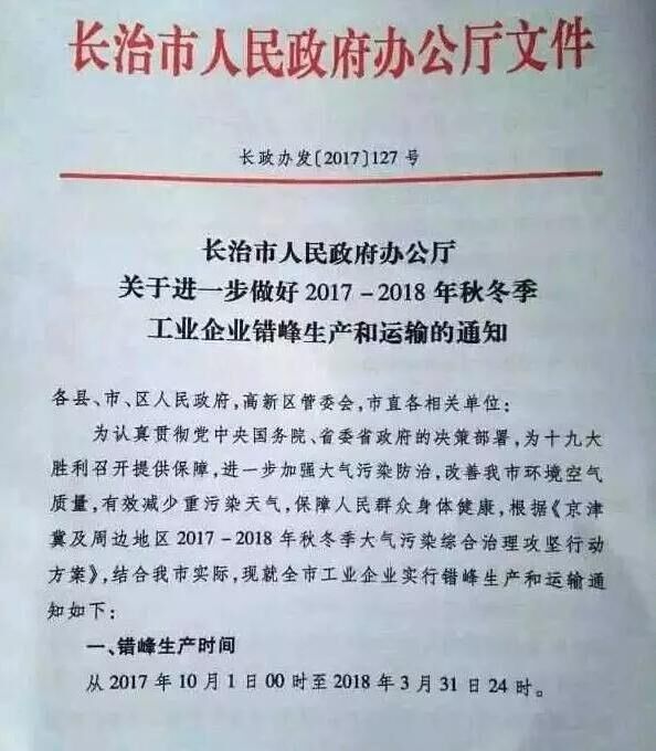 山西省長(zhǎng)治市也發(fā)布《關(guān)于進(jìn)一步做好2017-2018秋冬季工業(yè)企業(yè)錯(cuò)峰生產(chǎn)和運(yùn)輸?shù)耐ㄖ?。要求?017年10月1日00時(shí)起至2018年3月31日24時(shí),水泥(含粉磨站)等建材行業(yè)企業(yè)全部停產(chǎn)。