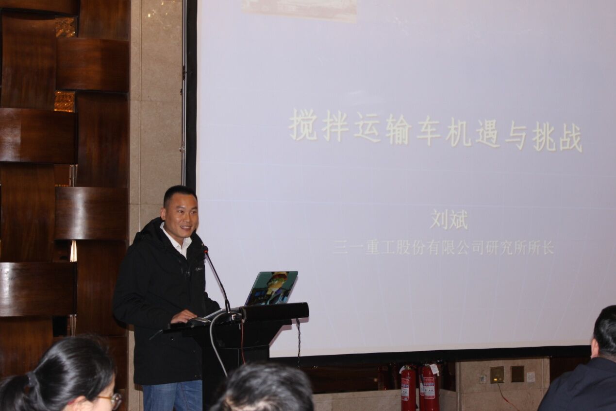 三一重工股份有限公司研究所所長劉斌先生作了《攪拌運輸車機遇與挑戰(zhàn)》的主題報告,從攪拌車面臨的五大機遇和三大挑戰(zhàn)分析,提出攪拌車的研發(fā)與生產要回歸本質,即運輸和質量,保證安全運輸、環(huán)保運輸、合標運輸、保證運輸?shù)幕炷临|量。