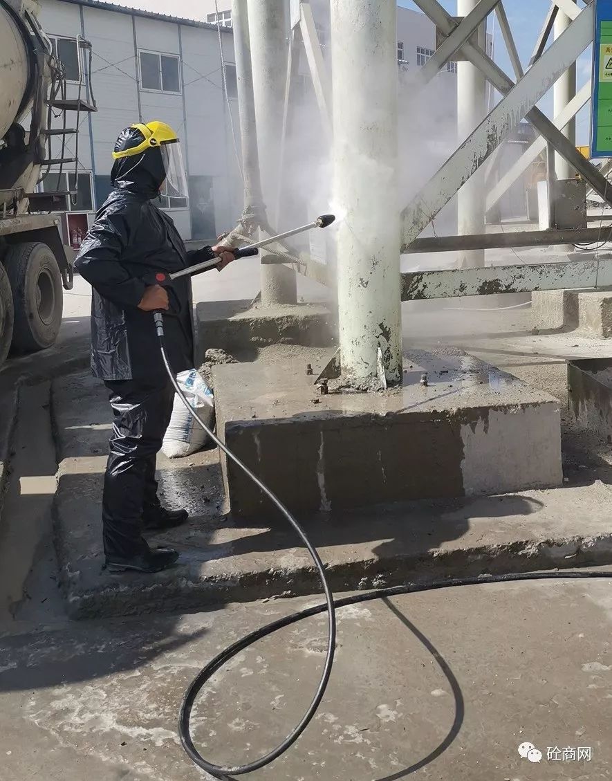 在楊技術員給站上工作人員進行初步講解指導后,首先對兩年沒有清理過的水泥倉支腿下方累積的混凝土進行了處理。那么,效果究竟怎么樣呢?具體視頻關注“砼商網(wǎng)”公眾號,回復“高壓清洗機”即可獲得技術員正準備打攪拌機主樓容易噴濺混凝土的地方時該攪拌站站長說道,這可得有兩年沒清理過的混凝土結(jié)塊,十幾公分厚呀!你們這高壓清洗機能打掉嗎?這是混凝土??!這么長時間了,還這么厚,打不下去怎么辦?正在小編心里打鼓的時候,楊技術員說道,沒問題,放心吧!