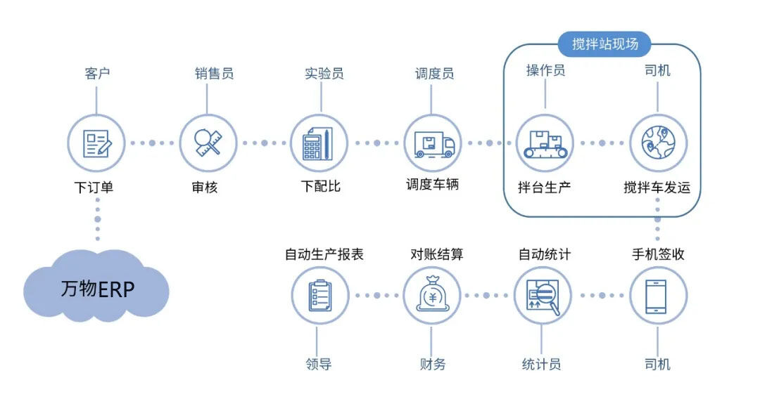 萬物ERP依托工業(yè)互聯(lián)網(wǎng)平臺(tái)技術(shù),將攪拌站大部分工作人員從攪拌站現(xiàn)場解放出來,在總部、在工地、在家中,不分白天黑夜,均能參與生產(chǎn)管理。