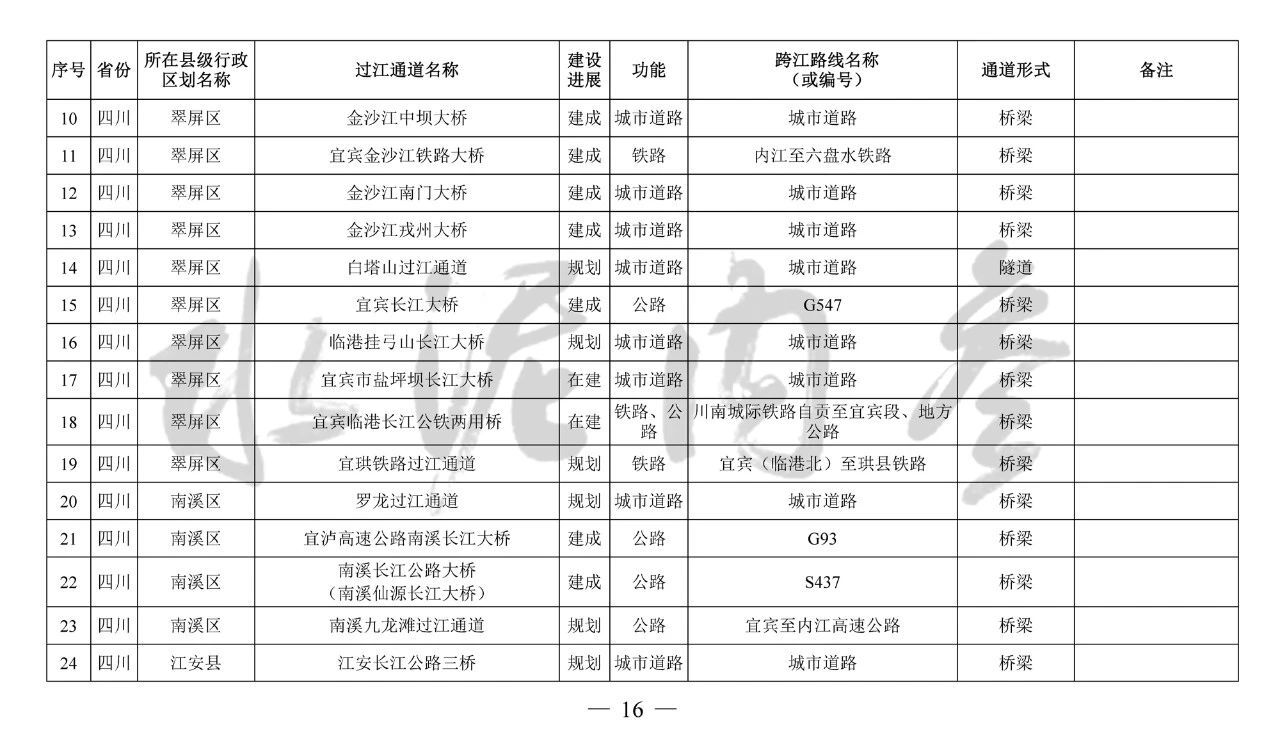 四川省(10座):雞翅膀大橋、臨港掛弓山長江大橋、羅龍過江通道、納溪過江通道(大渡口長江大橋)、安富第一過江通道(河東長江大橋)、瀘州藍田過江通道(長江五橋)、瀘遵過江通道、新路口過江通道、合江新城過江通道(白沙長江大橋)、榕山過江通道(榕山長江大橋)