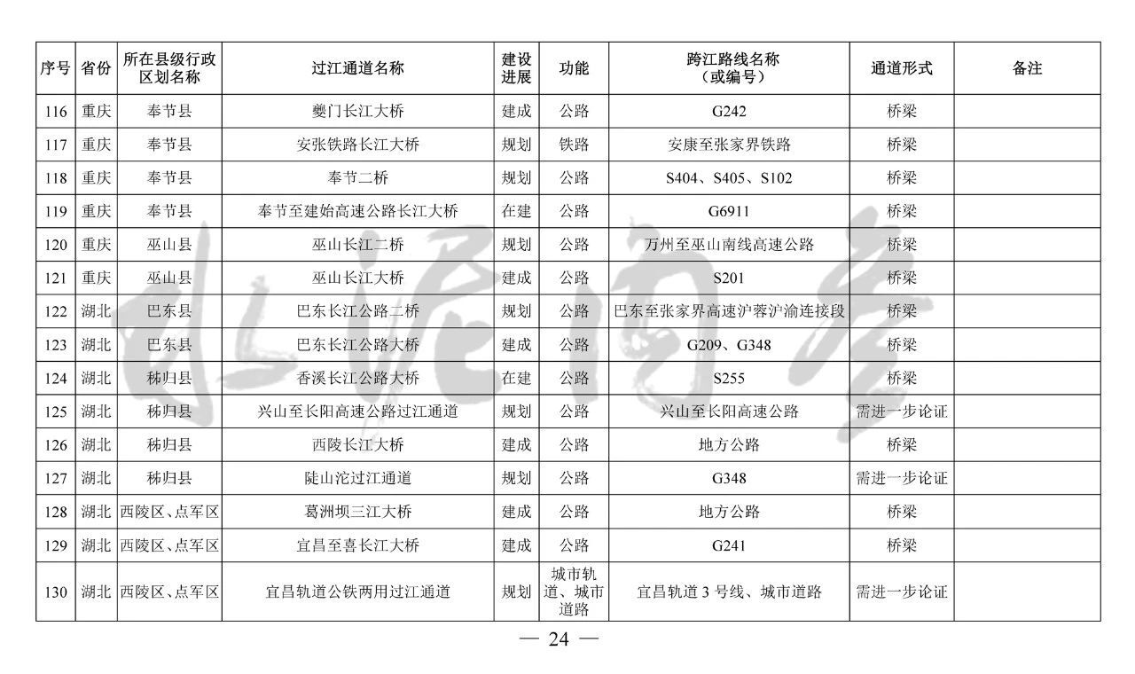 重慶市(17座):市域(郊)鐵路跳蹬至江津線長江大橋、西彭長江大橋(支坪長江大橋)、小南海長江大橋、中壩過江通道、黃桷坪長江大橋、軌道27號線過江通道、重慶至黔江鐵路過江通道、黃桷沱大橋、長壽長江三橋、涪陵石沱長江大橋、涪陵龍頭港長江大橋、涪陵江北長江大橋、興義長江大橋、西沱長江大橋、云陽復興長江大橋、奉節(jié)二橋、巫山長江二橋