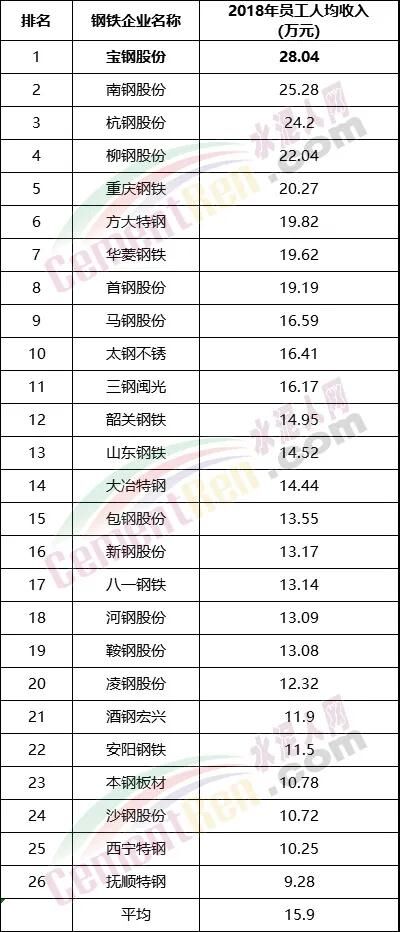 2018年上市鋼鐵公司員工薪酬排行榜