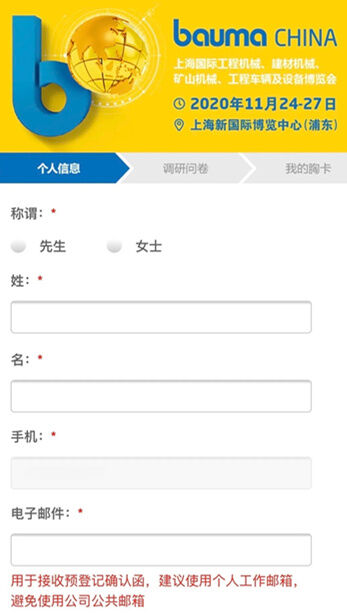 請(qǐng)按提示完整填寫您的個(gè)人信息。為方便您后期接受預(yù)登記確認(rèn)函、為同事注冊(cè),請(qǐng)務(wù)必確認(rèn)手機(jī)、郵箱、姓名準(zhǔn)確填寫。