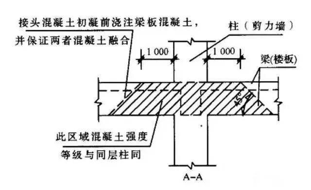 5、節(jié)點(diǎn)處的混凝土實(shí)行“先高后低”的澆搗原則,即先澆高強(qiáng)度等級(jí)混凝土,后澆低強(qiáng)度等級(jí)混凝土,嚴(yán)格控制在先澆筑混凝土初凝前繼續(xù)澆搗梁板的混凝土,事先做好技術(shù)交底和準(zhǔn)備工作。
