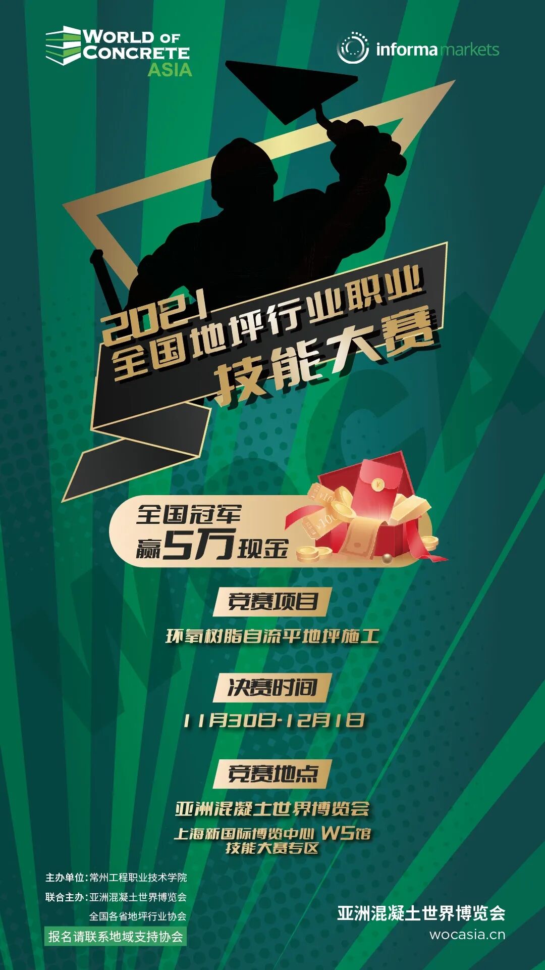 由常州工程職業(yè)技術(shù)學(xué)院、WOCA亞洲混凝土世界博覽會(huì)聯(lián)合主辦,地坪產(chǎn)業(yè)學(xué)院和各省地坪行業(yè)協(xié)會(huì)協(xié)辦的“2021年全國地坪行業(yè)職業(yè)技能大賽”,將在2021年亞洲混凝土世界博覽會(huì)展會(huì)現(xiàn)場舉行,全國冠軍將獲得五萬現(xiàn)金!
