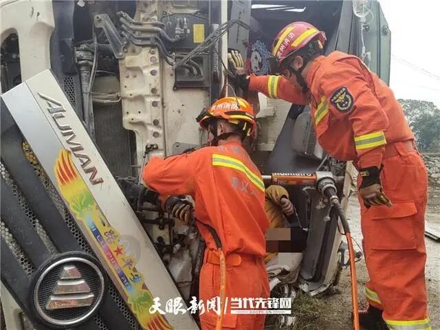 到達現(xiàn)場后,指揮員立即下車對現(xiàn)場情況進行偵查,發(fā)現(xiàn)事故車輛是一臺裝滿了35噸混凝土的罐車,由于雨天路滑,司機行駛到一段下坡路時因操作不當發(fā)生側翻。駕駛員被困在駕駛室內,駕駛室已嚴重變形,無法將車門正常開啟,現(xiàn)場醫(yī)護人員正為司機輸液補充能量。
