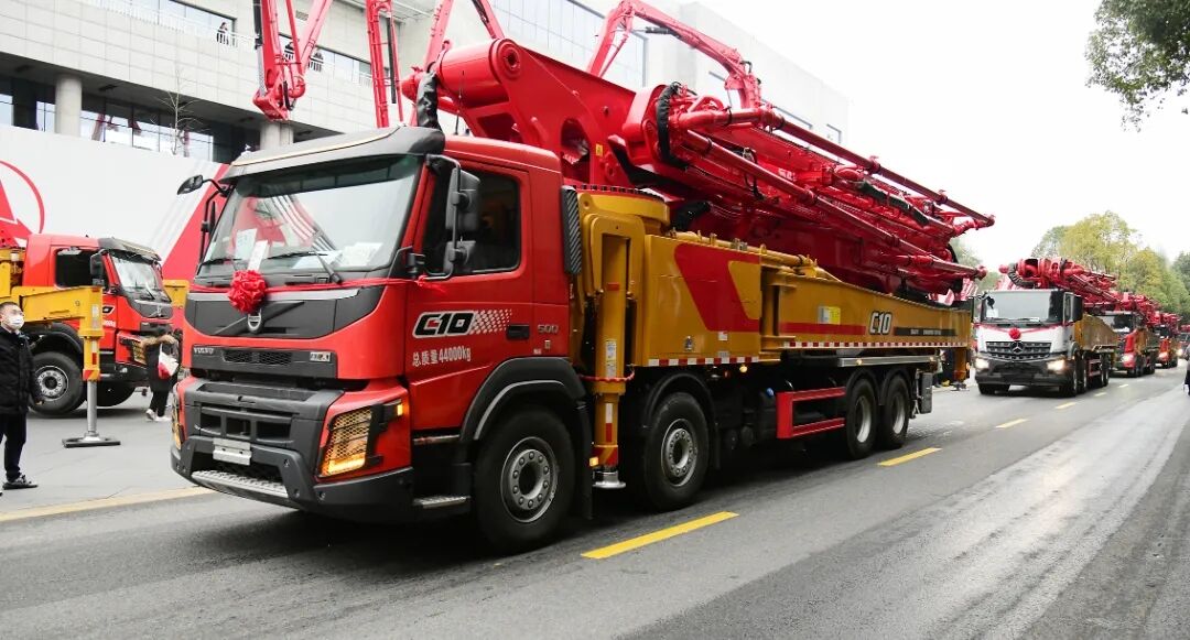 長沙廠區(qū)主干道上,66臺“世界泵王”整裝待發(fā),接受現(xiàn)場各位領(lǐng)導和來賓的檢閱。本次發(fā)貨的產(chǎn)品涵蓋37米、43米、56米等多款明星產(chǎn)品,更有S系列泵車的大力加持,大部分為國六新品。