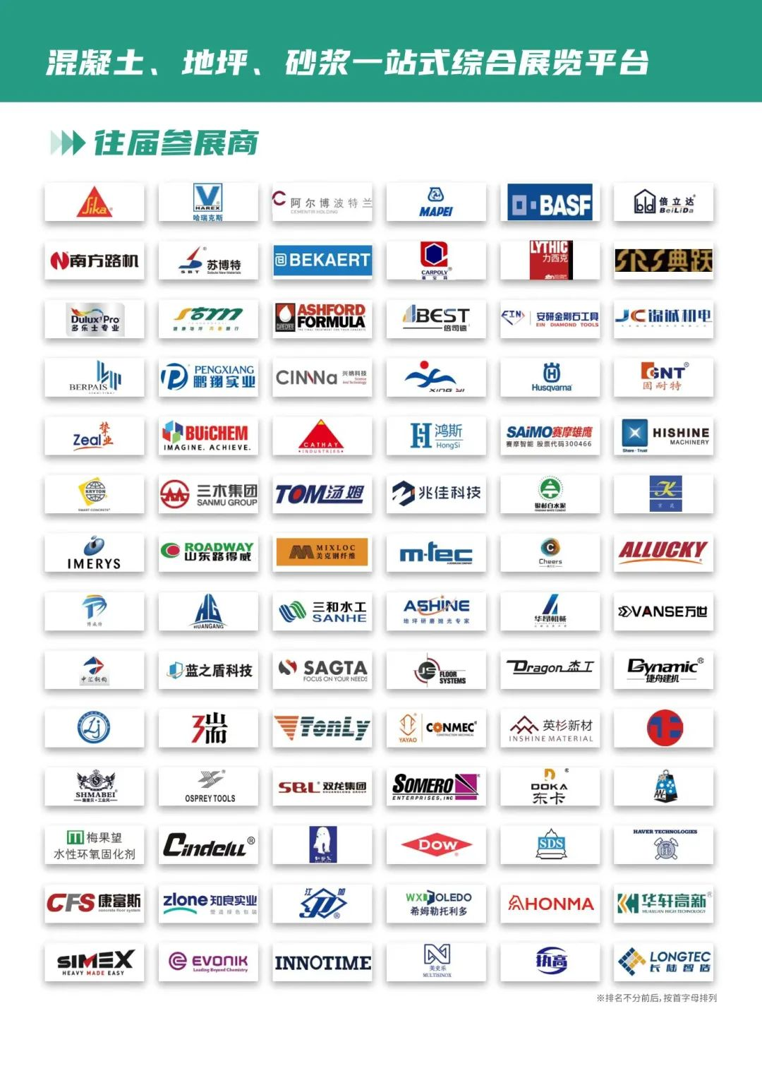 展品范圍:砂漿:水泥基砂漿,石膏基砂漿,特種砂漿等;砂漿生產(chǎn)設(shè)備,包裝設(shè)備等;運(yùn)輸設(shè)備;噴涂設(shè)備;砂漿添加劑