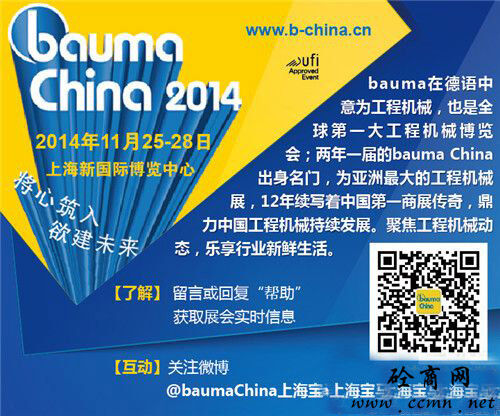 China 2014,11月25-28日行業(yè)翹楚絢麗登陸上海新國際博覽中心,工程機(jī)械行業(yè)產(chǎn)品全面細(xì)分展示??达L(fēng)云變幻,捕行業(yè)動向,我們相約bauma China 2014!
