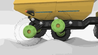Centaur鉸接式卡車具備強(qiáng)大的裝載能力,其載重能力或?qū)⒊^40噸,巨大的輪胎和堅(jiān)固的底盤支撐起了這只龐然大物。Centaur鉸卡采用了非常獨(dú)特的懸掛設(shè)計(jì),6個(gè)輪胎分別獨(dú)立地與主軸連接,連接處可以自由轉(zhuǎn)動(dòng),這使得Centaur在坎坷不平的路面上如履平地。