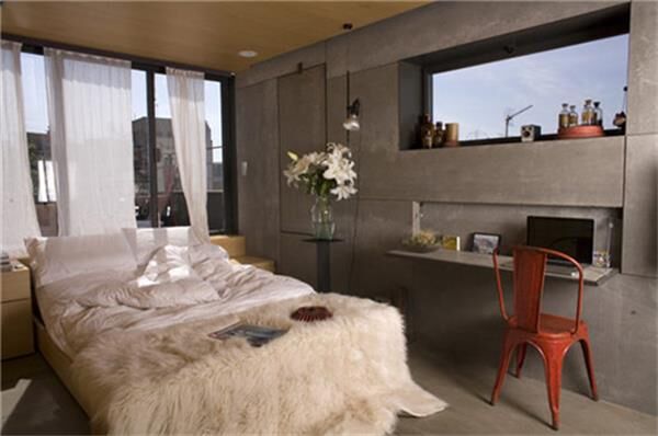 床的亮點設(shè)計在于它是可以伸縮的。白天可以推進去,這里充當(dāng)飄窗的作用。墻面也是頗有創(chuàng)意和實用性,隱藏在墻上的混凝土板,拉下來變成方便的書桌或是餐桌。