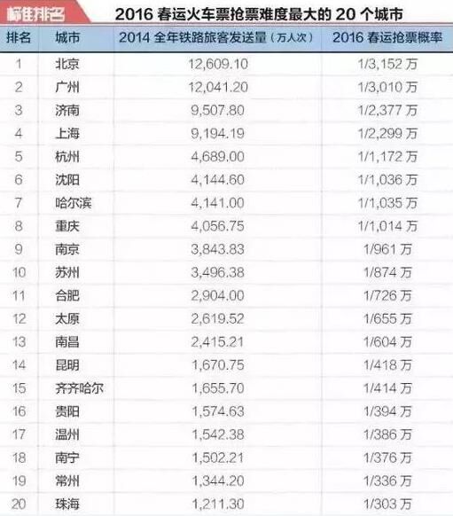 按照以上方法,標(biāo)準(zhǔn)排名在50個(gè)城市的數(shù)據(jù)基礎(chǔ)上,統(tǒng)計(jì)出了“2016春運(yùn)火車票搶票難度最大的20個(gè)城市”。其中,擁有大量外來(lái)人口的北京,當(dāng)仁不讓成為了出發(fā)地最難買票的城市;打工圣地廣州,位列第二;濟(jì)南作為人口大省山東的省會(huì),位列第三;上海和杭州緊隨其后,位列第四和第五;沈陽(yáng)、哈爾濱、重慶、南京、蘇州、合肥、太原、南昌、昆明、齊齊哈爾、貴陽(yáng)、溫州、南寧、常州和珠海分別進(jìn)入前20強(qiáng),入榜城市鐵路旅客發(fā)送量均超過(guò)1000萬(wàn)人次。