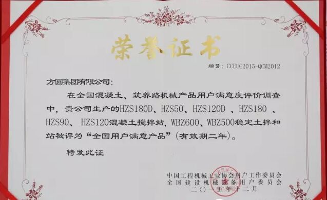 方圓集團憑借在售后服務領域的突出表現(xiàn),榮獲“用戶滿意服務單位”的稱號,同時,方圓集團生產(chǎn)的HZS180D、HZS50、HZS120D、HZS180、HZS90、HZS120型混凝土攪拌站,WBZ600、WBZ500型穩(wěn)定土拌和站被評為“全國用戶滿意產(chǎn)品”。