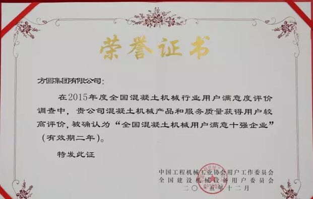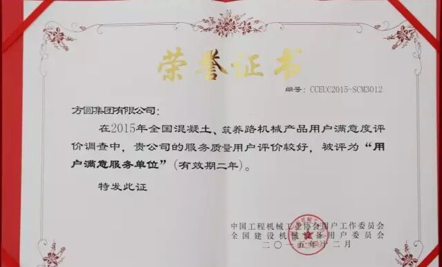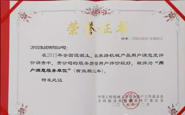此外,因為方圓集團在2015年度全國混凝土機械行業(yè)用戶滿意度評價調(diào)查中,受到廣大用戶的一致好評,被授予“全國混凝土機械用戶滿意十強企業(yè)”稱號。在產(chǎn)品質量調(diào)查中,連續(xù)七次被評為“全國用戶滿意單位”。