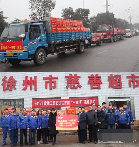 近日,八輛大卡車滿載著徐工全體員工的捐款和衣物,緩緩駛?cè)胄熘菔猩鐣头鲋行?,送去徐工承擔的社會?zé)任、徐工人的美德。2015年,在各單位的全力支持和全體員工暖暖愛心的捐助下,徐工集團扶貧濟困“一日捐”活動共收到捐款1382175.5元、捐衣物13830件,連續(xù)14年捐款捐物全市第一。