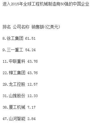 分析指出,受大宗商品價格下跌、新型經(jīng)濟體經(jīng)濟增速減緩和世界經(jīng)濟不景氣的影響,全球前50家工程機械制造企業(yè)總產(chǎn)值較上一年度下跌16.2%,達到1330億美元,創(chuàng)2009年以來新低。據(jù)中國工程機械商貿網(wǎng)編輯了解,2009年,工程機械行業(yè)一年銷售額下降了1090億美元。自那時起,工程機械行業(yè)收入下降趨勢一直未有改變。報告同時強調,榜單上下滑最為嚴重的是中國企業(yè),這很大程度上是因為中國經(jīng)濟增速的放緩。中國企業(yè)中,只有徐工集團仍然保持在前十強,位列榜單第九位?!斑@個市場趨勢表現(xiàn)最顯著的就是中國建筑設備制造商,相比去年,所有中國企業(yè)的排名有所下滑。排名前十的企業(yè)中,如今只有徐工一家中國工程機械制造廠商?!?/span>