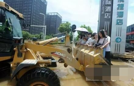 此時洪水涌動,伴隨發(fā)動機(jī)的轟鳴聲,一抹忙碌的徐工金沖破洪水的包圍來到他們面前,將鏟斗平穩(wěn)放在地上,似紳士伸出友好之手。大家心領(lǐng)神會,紛紛站進(jìn)斗里,享受這趟特殊的專車服務(wù)。