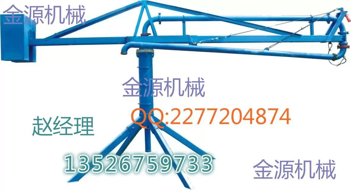 結(jié)構(gòu):、插銷(xiāo)、立架、構(gòu)成的底座是固定部分,其上通過(guò)回轉(zhuǎn)支承與上部回轉(zhuǎn)部分相連,上主梁架、平衡臂、平衡臂架拉桿、上橫桿組成后回轉(zhuǎn)部分。立管上有回轉(zhuǎn)卡篐接頭。通過(guò)人力拉動(dòng),可使整個(gè)回轉(zhuǎn)部分回轉(zhuǎn)360度。上梁主架前端連接有一個(gè)回轉(zhuǎn)支座與前橫桿、前拉桿組成前回轉(zhuǎn)部分,在人力拉動(dòng)下可繞回轉(zhuǎn)支座旋轉(zhuǎn)300度。由兩部分回轉(zhuǎn)架組成的合成運(yùn)動(dòng)就能覆蓋所有布料半徑范圍的布料點(diǎn)。