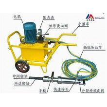 公路、鐵路修建遇巖石、城市、村寨需開挖房基遇巖石等狀況,石方很大的情況下,每個(gè)工作點(diǎn)可選用如下設(shè)備:鑿巖機(jī)3~4臺(tái)(配空壓機(jī)),液壓分裂機(jī)一臺(tái)(配2~3把劈裂頭),挖掘機(jī)一臺(tái)(配破碎錘)。具體操作如下:先將巖石上的泥土清理干凈,而根據(jù)巖石的紋理,在巖石上用鑿巖機(jī)鉆一組孔,每組孔以配劈裂頭的數(shù)量而定,孔距可根據(jù)不同巖石而定,一般在80cm~120cm左右,鉆好一組孔后立即將這組孔的巖石劈裂開,看劈裂的情況以便確定下一組孔的位置及方向。液壓分裂機(jī)有一個(gè)很重要的特性就是所劈裂體的劈裂位置要處于在兩邊對(duì)等相抗的位置上,不能一邊太薄而走漂。這樣劈裂的效果就不太明顯。一般情況下,所打的孔臨空面1米至1.5米就可以。劈裂深度亦視巖石的狀況而定,整體性越好劈裂深度就越深,可達(dá)2~3米。因液壓分裂機(jī)只能把巖石劈裂而不能將劈裂的石塊移出,而挖掘機(jī)的破碎錘又很難將山體上的巖石破碎,但液壓分裂機(jī)劈裂開的石塊又能輕而易舉將其移出,再將大塊的巖石破碎,易于裝卸。所以液壓分裂機(jī)與破碎錘配合使用既安全、效率又高。
