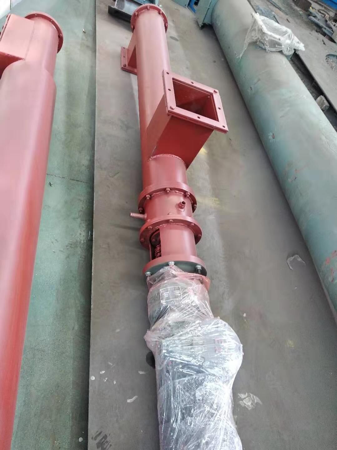 螺旋輸送機(jī)螺旋面的形式有實(shí)體螺旋(S制法)和帶式螺旋(D制法)兩種。各螺旋軸之間采用法蘭式聯(lián)接, 保證了聯(lián)接軸的互換性,便于維修。 螺旋輸送機(jī)機(jī)蓋為瓦片式并用蓋扣夾緊在機(jī)殼上,若需改進(jìn)密封性能,用戶可自行在機(jī)蓋與機(jī)殼間加防水粗帆布。 螺旋輸送機(jī)進(jìn),出料裝置有進(jìn)料口,方型出料口,手推式出料口,齒條式出料口四種,由用戶在使用現(xiàn)場(chǎng)在機(jī)體上開口焊接。布置螺旋輸送機(jī)進(jìn),出料口位置時(shí)應(yīng)注意保證料口至端部的距離,同時(shí)避免料口與吊軸承加油杯,機(jī)殼聯(lián)接法蘭,底座等相碰。