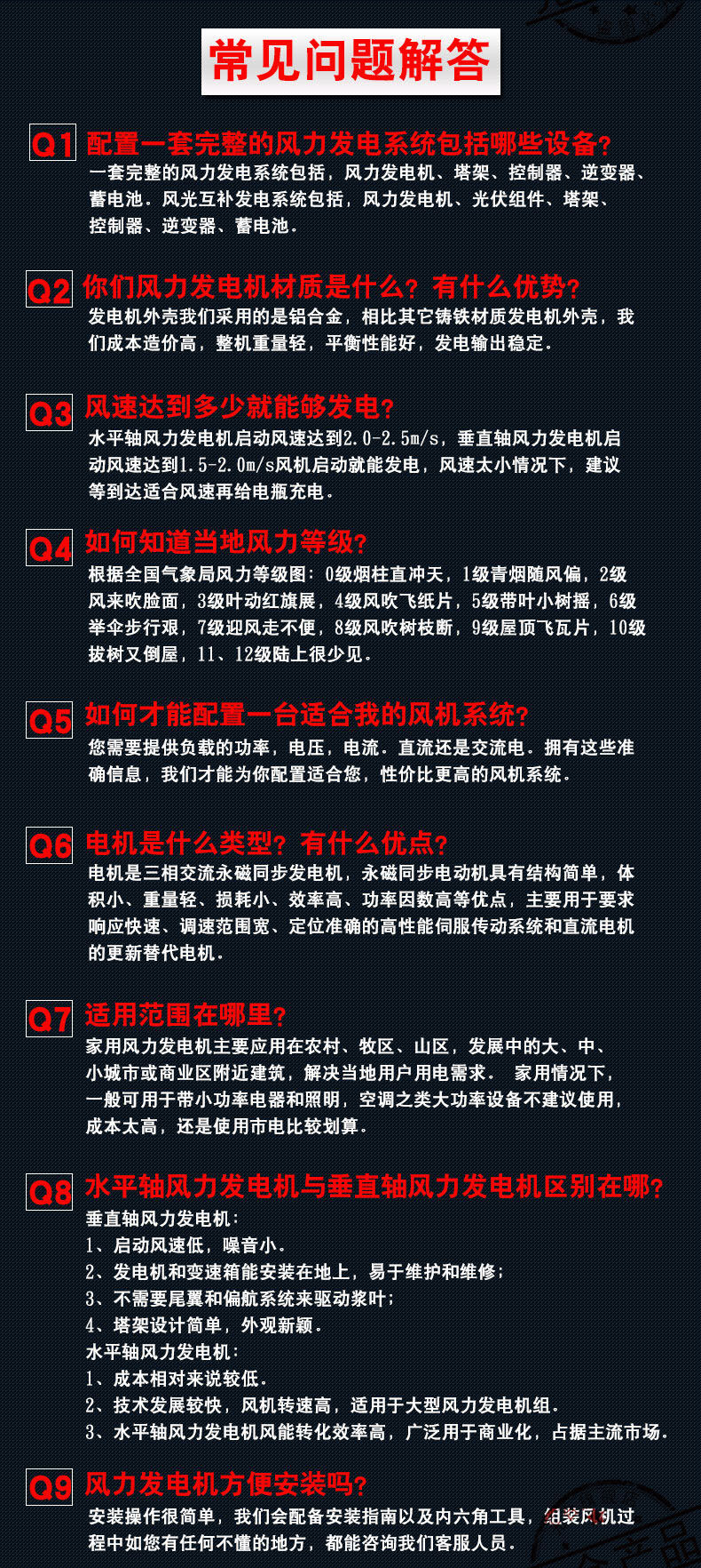 注意:以上寶貝報價為風力發(fā)電機主體的價格(含:5KW發(fā)電機、回轉(zhuǎn)體、尾舵、風輪、風葉等組件),如需逆變器、蓄電池、控制器、太陽能板或塔架,請咨詢客服。