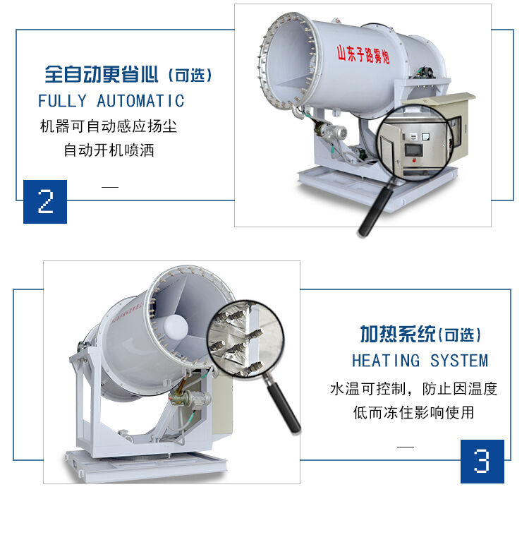 直徑相近的水霧和的粉塵顆粒黏貼,減小水表面的張力,使粉塵顆粒與水霧聚結成團,在重力作用下,然后沉降到地面。達到有效降塵的目的。霧炮機的噴水距離為30到150米,具體規(guī)格可以定制,配套水箱可選3-10噸,主要作用是噴霧抑塵,