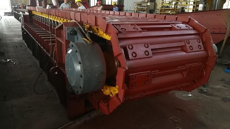 整機的工作原理為:設備安裝于料倉下,料倉底部物料直接壓在設備的鏈板組件上,料倉的前部有寬度為1.8m的開口,當動力部件帶動主軸旋轉時,鏈板組件隨之在料倉下向前移動,帶動料倉底部物料通過缺口移出料倉,物料到主軸處鏈板組件改向時下落,完成物料的輸送工作。主軸下部可設破碎機,也可直接設帶式輸送機,對物料進行下一步的長距離輸送。