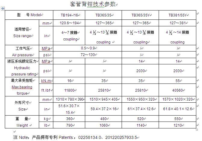 TB套管背鉗為專利產(chǎn)品,可與油田現(xiàn)使用的各類套管動力鉗配合進(jìn)行下套管作業(yè),能提高管柱絲扣聯(lián)接質(zhì)量,減少主鉗大扭矩作業(yè)的變形,提高作業(yè)的安全性、可靠性,減輕工人勞動強度,提高作業(yè)效率。該產(chǎn)品按控制方式有全氣、液控兩種。設(shè)有扭矩傳感器,可精確測出管柱聯(lián)接的扭矩。表中為背鉗參數(shù)。動力鉗符合SY/T5074標(biāo)準(zhǔn)和API Spec 7K規(guī)范。